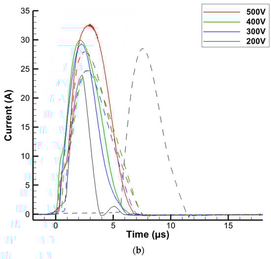 Current discharge plots of high-voltage capacitors for (a) Thruster 1 (left-mounted thruster) and (b) Thruster 2 (right-mounted thruster). Solid lines represent 0.22 µF capacitors, while dashed lines correspond to 0.1 µF capacitors.
