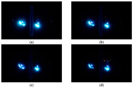 DSLR photographs of VAT pairs operating on 0.1 µF capacitors at (a) 500 V; (b) 400 V; (c) 300 V; and (d) 200 V.