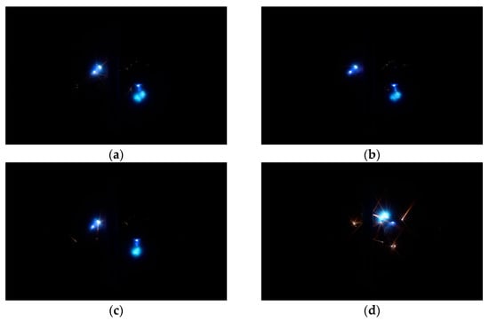 DSLR photographs of VAT pairs operating on 0.22 µF capacitors at (a) 500 V; (b) 400 V; (c) 300 V; and (d) 200 V.