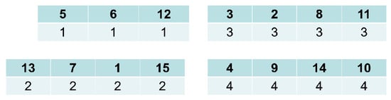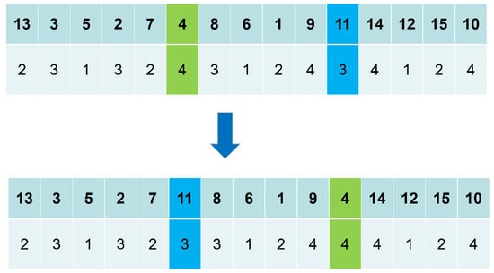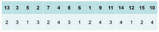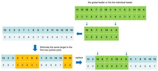 The encoding of the UAV combat mission assignment scheme is the most critical part of the algorithm. Traditional encoding cannot satisfy the requirements of the model due to the complexity of the objective function and constraint conditions; therefore, a new encoding method is introduced to overcome this problem. There are two rows for each particle: the top row contains targets from the set , where m is denoted as the number of targets; the second row is the UAV chosen to attack target from the set , where n is denoted as the number of UAVs. They are arranged according to the order of attacking target. Moreover, particles are split into a set of UAV-based sub-particles to visually indicate the order in which each UAV attacks targets. Figure 2 shows the encoding of the UAV combat mission assignment scheme. Figure 3 shows an example of a particle for the scenario of three targets being attacked by ,, four targets being attacked by , , four targets being attacked by , , and four targets being attacked by , .