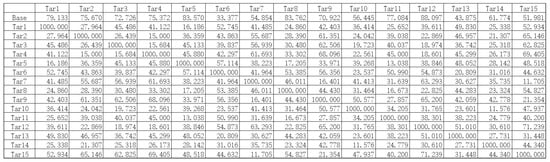 The distance between the i-th target and the j-th target is the scalar, denoted by . We set the target value of the j-th target as an uncertain variable, , and let be its uncertainty distribution, here. Our objective is to obtain the maximum target values, formulated as