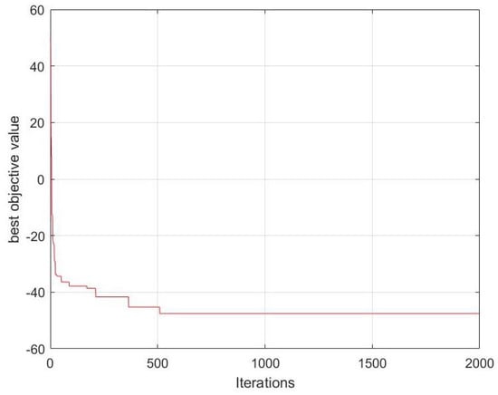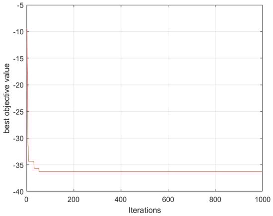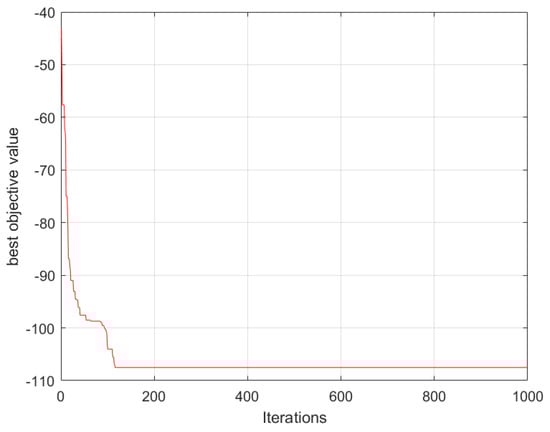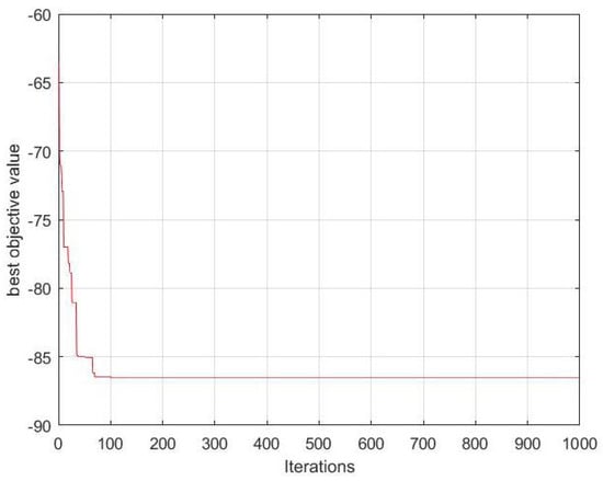 And under the improved PSO algorithm, the results are shown in Figure 11. We present the optimal UAV combat mission assignment scheme in Table 4 and in Figure 12. From Figure 12, we can see that all targets attacked by the all UAVs satisfied constraints. Further, it can be noticed that targets were attacked by different UAVs. Moreover, the results show that the objective value was −86.55; that is, the maximum target values was 86.55. We set the maximum iteration limit to 1000, and it quickly converged to the optimal solution after only 69 iterations. This indicates that the modified PSO algorithm was more effective.