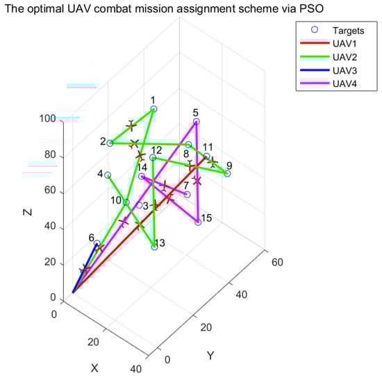The figure of the optimal UAV combat mission assignment scheme obtained by PSO.