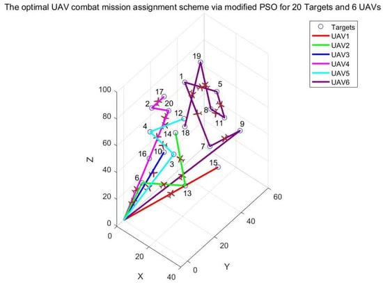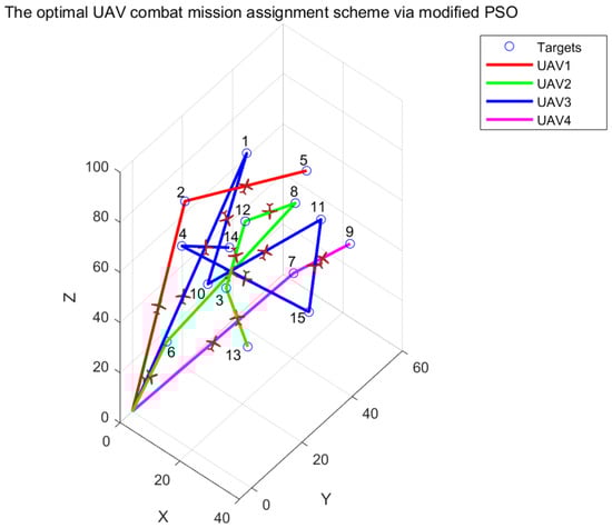 The results under the modified PSO algorithm are shown in Figure 17. We present the optimal UAV combat mission assignment scheme in Table 8 and in Figure 18. From Figure 18, it can be observed that all targets were successfully engaged by the all UAVs. Furthermore, the results show that the maximum target values achieved was 107.52. With the maximum iteration limit also set to 1000, and the algorithm quickly converged to the optimal solution after only 122 iterations. That indicates that the modified PSO algorithm demonstrates strong applicability to complex task mission assignment scenarios, highlighting its robust practical utility in real-world task allocation problems.