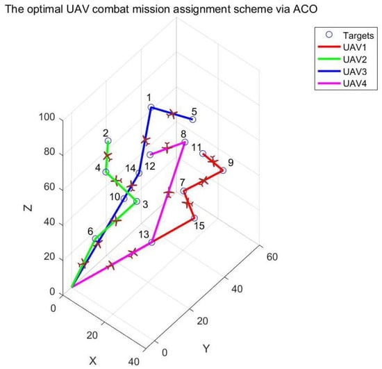 To further validate the effectiveness of the the modified PSO algorithm, we conducted simulation comparisons with ant colony optimization (ACO). Under identical parameter settings—where four UAVs engaged 15 targets—the result is shown in Figure 13. We also present the optimal UAV combat mission assignment scheme in Table 5 and in Figure 14. From Figure 14, we can see that the ACO rapidly converged to a local optimum value of 36.31, demonstrating its susceptibility to premature convergence. This highlights the limitation of ACO in escaping local optimal solutions due to its heuristic pheromone-based search strategy, which often leads to the myopic exploration of the solution space.