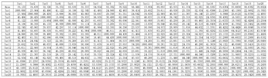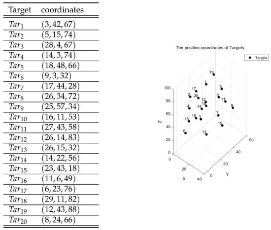 Next, we constructed a more complex combat scenario, where six UAVs were tasked with striking 20 mission targets. The specific details are as follows. The value per unit fuel c was also set to 0.7. The maximum fuel storage , the maximum flight distance , the aircraft damage cost due to replenishing the fuel , and the zigzag uncertainty distribution of the fuel consumption per unit distance, (), of UAVs are shown in Table 6.