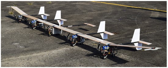 The ITA X-HALE aircraft, illustrated in Figure 1, has a total mass of 12.363 kg. Its modular wing design consists of six segments, each with a span of 1.0 m and a chord of 0.2 m. Electric motors, landing gear, and onboard electronics are housed in pods located at the junctions between adjacent modules. Attached to these pods are booms that extend rearward, each supporting a tail assembly at its tip. The central tail can be fixed either in a horizontal or vertical position to adjust the aircraft’s lateral–directional characteristics. In this study, the central tail is fixed in the vertical position. The side tails are all-moving control surfaces, known as elevons, capable of providing both longitudinal and lateral–directional control. The outermost wing modules incorporate a 10° dihedral angle, and the entire wing is mounted with a 5° incidence angle. The wing uses the EMX-07 reflexed airfoil, while the tail surfaces are based on the NACA 0012 airfoil.