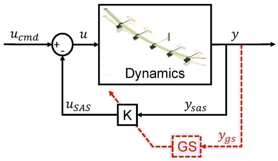 where A, B, and C are the state-space representation matrices, is the state vector, is the control input, and is the measured output [23]. The SAS control signal is the output feedback given the following: