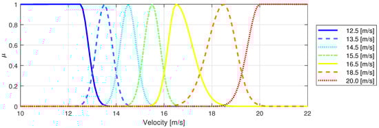 The weight is the mathematical form to ponder each rule according to the scheduled variable value, and (standard deviation) is a design parameter that measures how the neighbor antecedents affect the consequence. If is too small, the controller’s transition becomes excessively sharp. Conversely, if is too large, the influence of nearby design points may exceed the desired level. We selected a set of values such that, at the design point, the weight of the nearest neighbors approaches zero, while at the midpoint, both points are assigned equal weight. In Figure 3, seven membership functions (), one for each velocity selected, with Gaussian form, are displayed, and the weight for each rule is given by . Eventually, the weights are normalized by the sum of all rules’ weights so that the sum of all normalized weights is always equal to 1. Therefore, the normalized weights are given as follows: