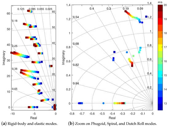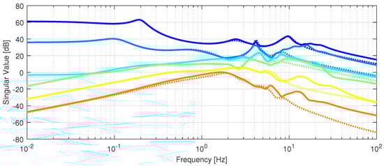 The rationale for selecting outputs in Equation (41) is as follows: is considered to measure the SP and phugoid mode effects; , , and are selected to measure the lateral–directional motion. The fifth element of corresponds to a combination of signals to capture the anti-symmetric bending modes, whereas the sixth element captures the symmetric bending motion. Lastly, and similarly, the seventh and eighth signal combinations capture the symmetric and anti-symmetric in-plane modes, respectively.