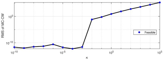 The second property delineated above underscores the dependency of the approximation of Equation (31) on the variable . Consequently, the overarching objective is to achieve a small positive value for , ensuring the convergence of the right-hand side of Equation (31) towards zero. It is, nevertheless, imperative to strike a judicious balance to prevent from diminishing to an extent that might render the LMI infeasible. With the approximation proposed, the following LMI sets were obtained: