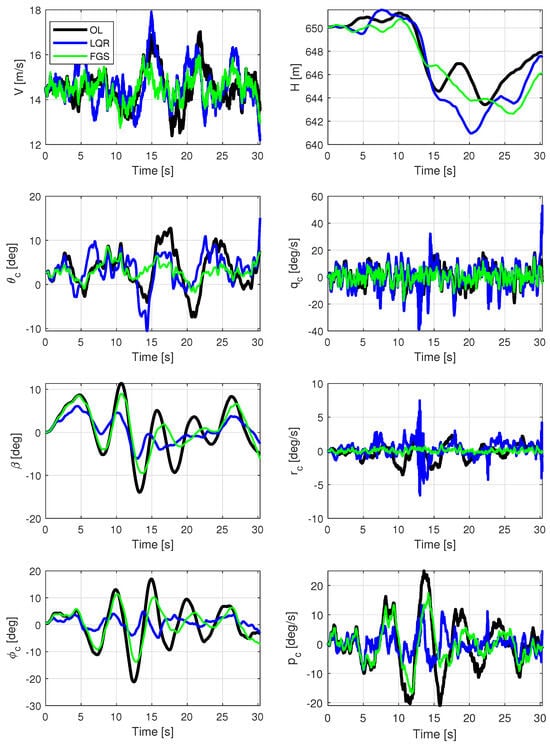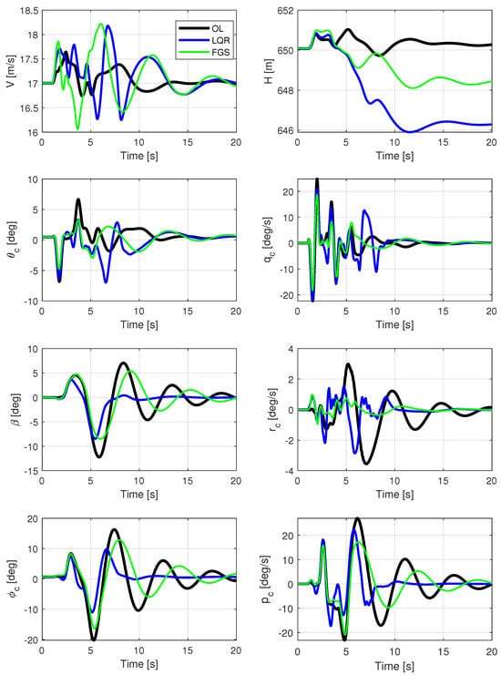 The rigid body results in Figure 14 exhibit a similar pattern in terms of attenuations, with the LQR showing a superior response in lateral–directional motion and the FGS outperforming in longitudinal motion. Notably, instabilities are observed in for the LQR design, particularly as the phugoid mode is degenerated and couples with the spiral mode, leading to instability at a flight velocity of m/s. Consequently, whenever the aircraft traverses this unstable region, the LQR design exhibits an inappropriate response, causing the simulation to crash after 30 s. In the other two instances when the aircraft passes through the unstable region, the aircraft recovers because the turbulence itself increases the aircraft’s velocity.
