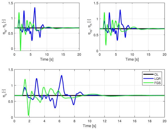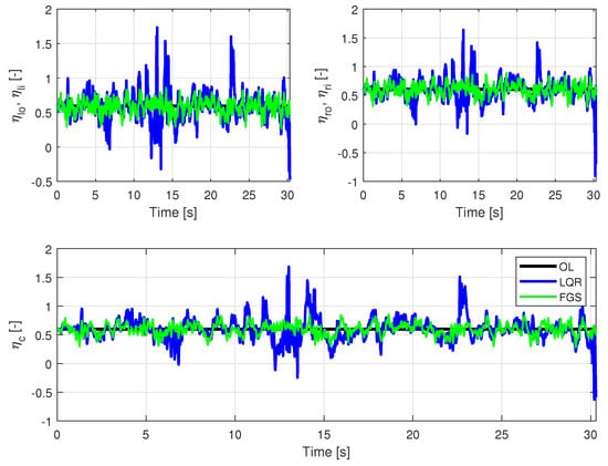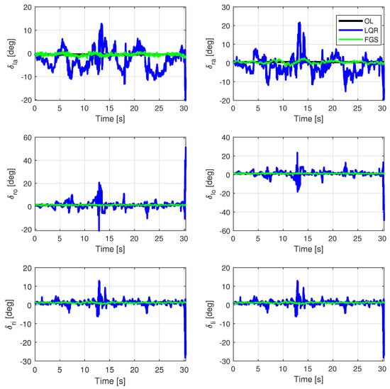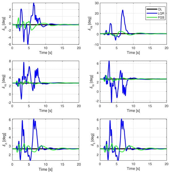 Concerning control energy, as depicted in Figure 12 and Figure 13, and highlighted in Table 2, the gains calculated with FGS exhibited superior performance, utilizing less control effort compared to the LQR. This is evident for both control surfaces and motors. Table 2 illustrates the RMS values. Although the physical limits were exceeded by the motors, the FGS design performed better in this regard.