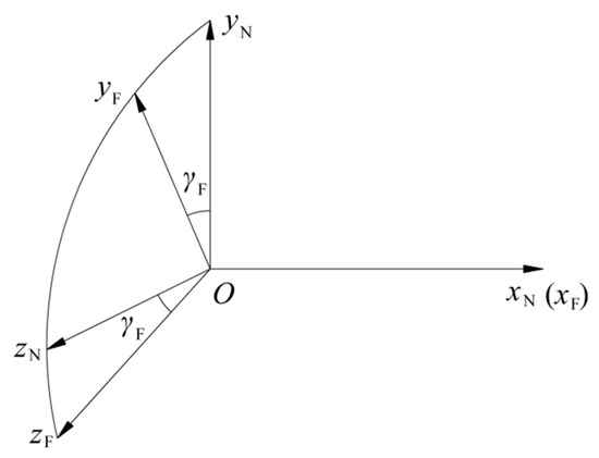 Based on the flight characteristics and the correction principle of this type of aircraft, it typically enters the controlled flight phase after a certain period of time following launch and achieves ballistic correction by deflecting the forced motion of the complex angle of attack and the complex velocity angle [5]. During this time, the Mach number (Ma) ranges from 1.0 to 2.0. Therefore, this paper selects Ma = 1.5 as an example to study the primary nonlinear aerodynamics of the aircraft body, subsequently verifies that the established aerodynamic model is reasonable and effective, and analyzes its influence on the controlled angular motion and corrected ballistics. To facilitate the direction determination of the aerodynamic forces and moments acting on the aircraft body in any flight state, the non-rolling reference frame OxNyNzN, the aircraft reference frame OxByBzB, and the forebody reference frame OxFyFzF are introduced [29]. The transformation relationship between the forebody reference frame and the non-rolling reference frame is shown in Figure 2, where γF, characterizing the angle between the forebody longitudinal symmetry plane and the OxNyN plane, is the forebody roll angle, which is positive when the OyF axis is pointing to the right side of the OxNyN plane and negative when the opposite is true. Accordingly, the complex angle of attack, which is used to accurately describe the spatial orientation of the longitudinal axis with respect to the velocity vector, can be expressed as follows: