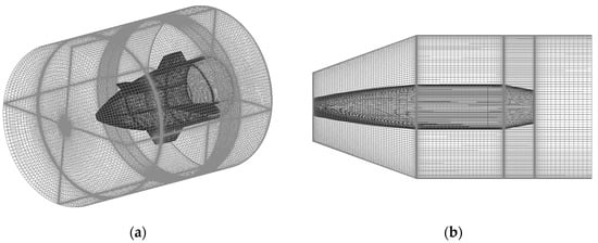 For the dual-spin angular motion of the aircraft, this study divides the calculation domain, which is a cylindrical flow field where the upstream and downstream lengths are 5 and 10 times the aircraft length, respectively, and the radial distance is 25 times the aircraft diameter, into the forebody, afterbody, and external flow areas. Structured grids are generated for each area separately, and the data exchange between different areas is realized through interfaces. By refining the grid near the wall surface to ensure the accuracy of results, a fluid calculation grid with a maximum skewness of 0.5576 and a minimum orthogonality of 0.1369 is obtained, in which the mesh structure of the fore/aft body flow areas is depicted in Figure 3.