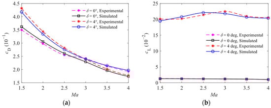 The sliding mesh technique and numerical model employed in this study have been extensively applied in aerodynamic simulation of rotation-stabilized aircraft and proven effective in predicting the aerodynamic forces and moments of such aircraft [13,14,15,16,17,18,19,20,21,22,23,24]. To further validate the reliability for aerodynamic calculation of canard dual-spin aircraft, numerical simulations are conducted on the aircraft of Ref. [23], which features two pairs of fixed canards on the forebody and is structurally similar to the research subject of this paper. Given that the selected aircraft diameter is the same as that of the research object, setting the reference area to S = πd2/4 yields the variation curves of the total drag coefficient (cD) and lift coefficient (cL) with Mach number at δ = 0 deg and 4 deg, as shown in Figure 4. Comparing these results with the wind tunnel experimental data of Ref. [23], it is evident that they are in good agreement, with the maximum relative errors of cD and cL not exceeding 3.5% within the Mach number range of 1.5 to 2.5. These results validate that the numerical method adopted in this study is reliable and can be effectively used to calculate and analyze the aerodynamic characteristics of such aircraft at Ma = 1.5.