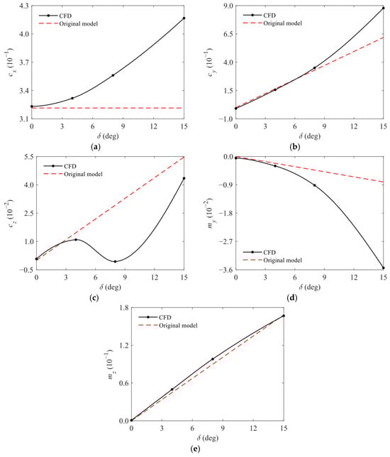 Curves of aerodynamic coefficients with δ: (a) curves of cx with δ; (b) curves of cy with δ; (c) curves of cz with δ; (d) curves of my with δ; (e) curves of mz with δ.
