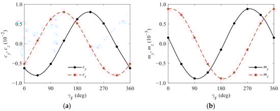 Curves of aerodynamic coefficients with γF: (a) curves of cy and cz with γF; (b) curves of my and mz with γF.