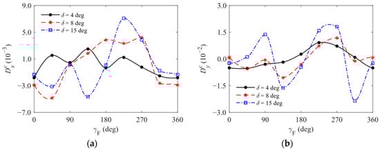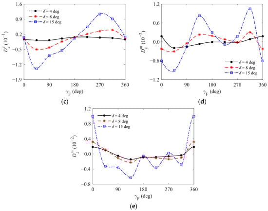 For the case of δ ≠ 0 deg, by calculating the aerodynamic forces and moments acting on the aircraft body at δ values of 4 deg, 8 deg, and 15 deg, and treating each aerodynamic coefficient as fluctuating around its period mean, the coefficients of deviation representing the difference between the actual value and the period mean can be obtained for cx, cy, cz, my, and mz, denoted as , , , , and , respectively, and their variation curves with γF are shown in Figure 7. When combined with Figure 6, the observations are obtained as follows: