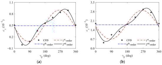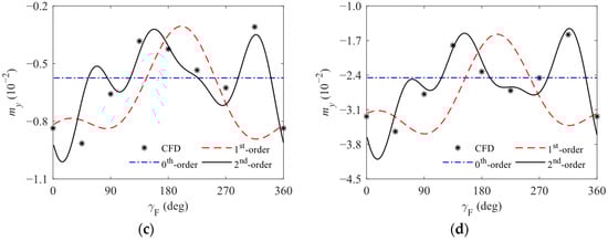 where fi,j and hi,j can be determined by the method proposed in Section 3.2. As β equals γF when υ = 0 deg, the variation of fi,j and hi,j with β can be derived by selecting multiple sets of the body aerodynamic force and moment coefficients that correspond to different γF to fit as polynomials of δ, along with substituting them with the parameters of the original aircraft into Equations (14) and (19). Considering the relatively minor periodic variation of cx, it is reasonable to treat f1,j as constants. The remaining parameters are subsequently subjected to Fourier transformations to derive their 0th-, 1st-, and 2nd-order coefficients, as shown in Table 5 and Table 6.