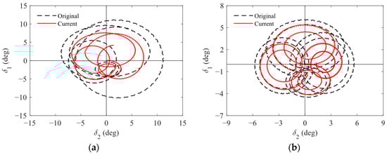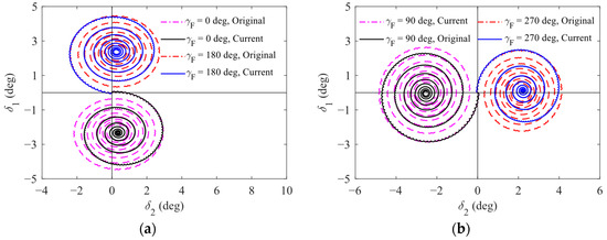 By substituting Equations (21) and (22) into Equation (23) and assuming that the initial perturbation has converged, the ballistic simulations are conducted at the starting control point using the established mode. Figure 9 depicts the results of the complex perturbation angle of attack curves for γF values of 0 deg, 90 deg, 180 deg, and 270 deg. When considering the nonlinear terms of body aerodynamic forces and moments, and their variation characteristics with δ, υ, and γF, compared with the results obtained using the original aerodynamic model—a model that is essentially identical to those in Refs. [4,5,6,7,8,9,10,11,25,26,27,28,29,30]—the final equilibrium position of the complex perturbation angle of attack has little difference. However, notable disparities emerge in the convergence speed of the free angular motion, with the amplitude attenuation within a slow circular period being approximately 1.5 to 3 times than that of the original literature, and the specific values fluctuating with changes in the orientation of the forebody roll angle. Consequently, a pronounced asymmetric characteristic is exhibited in the three-circular angular motion during the initial controlled flight stage, resulting in a deviation of approximately 0.67 deg before the completion of the 1st cycle period, which is about 30% of the original equilibrium angle.