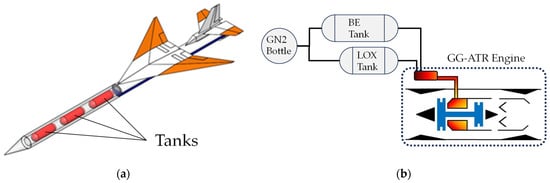 Figure 1 presents an overview of the small-scale supersonic flight experiment vehicle and propulsion system targeted in this research [,]. In addition, Table 1 presents the general specification of this experimental vehicle []. As depicted in Figure 1, the tanks for BE (fuel) and LOX (oxidizer) are installed on the aircraft, and BE and LOX are supplied to the engine via pressurization with nitrogen gas (GN2). Based on an analysis of the engine system, the BE and LOX flow rates during rated operation were determined to be 36 L/min and 12 L/min, respectively.