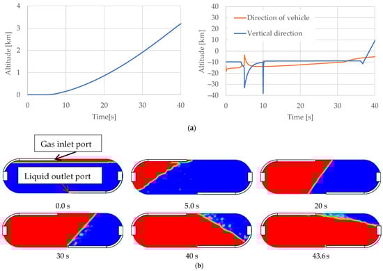 The flight sequence aimed to reach a Mach number of 1.0 for the small−scale supersonic flight experiment vehicle equipped with the tank and to observe the behavior of the liquid inside the tank. (a) Flight path (left) and acceleration (right) applied for the small-scale supersonic flight experiment vehicle []; (b) Fluid behavior in the tank []. The blue portion represents the liquid phase and the red portion represents the gas phase.