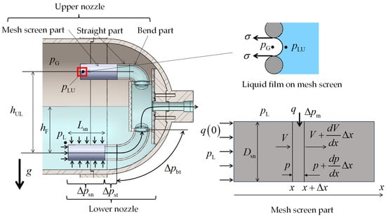 When the level of the free surface becomes lower than the upper end of the mesh screen part on the lower nozzle, the contacting area of the screen mesh on the liquid decreases with , and the flow velocity and pressure loss through the screen mesh increase. To express this effect, the law of conservation of mass (Equation (5)) and the pressure loss formula through the mesh screen part (Equations (9) and (10)) can account for the dependence of the area of the liquid contacting part on .