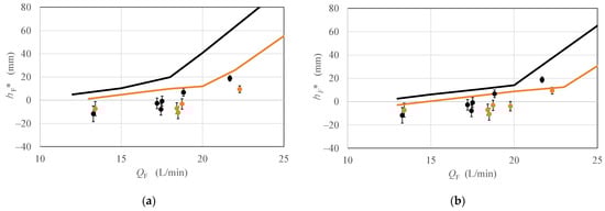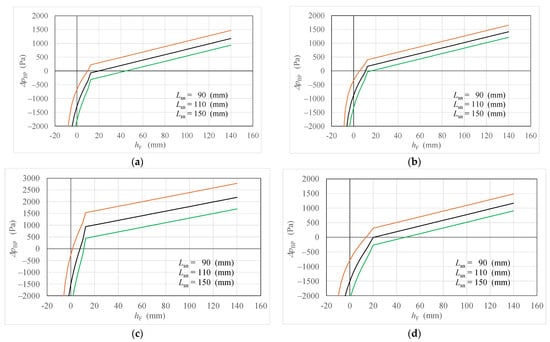 In order to make a comparison between the analytical results described in Section 2 and the experimental results described in Section 3, the relationship between the liquid discharge flow rate and the free surface height at which gas entrapment occurred was obtained from the flow analysis for two types of , and the experimental results were plotted against this. In the numerical analysis, the relationship between and was obtained for each , and from this results, and the relationship between and were obtained. Figure 15 illustrates the numerical results for mesh screens with lengths of 110 mm and 150 mm. Here, we present the results obtained using Hartwig’s and Ingmanson’s formulas to calculate the pressure loss through the mesh screen. From this figure, = 12.5 mm indicates that the free surface reached the top of the lower nozzle. At mm, the wetted area of the screen mesh decreased, and the pressure loss through the screen mesh therefore increased. As a result, compared to the condition in mm, the rate of change in relative to decreased, and the slope of this curve therefore decreased.