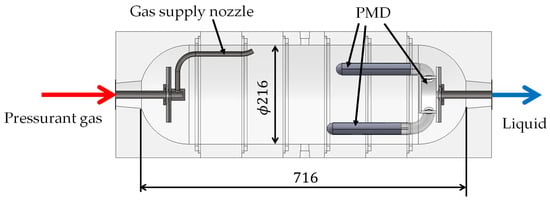 Figure 5 presents a drawing of the test tank. The tank is made of transparent polycarbonate resin, allowing the internal flow behavior to be visualized. The inner wall of the tank was formed by stacking rectangular blocks with hollowed-out hemispheres and cylinders. By making the outer wall of the test tank a flat surface, we reduced the effects of refraction when visualizing the tank interior. The PMD was installed on the liquid outlet side (i.e., right side of the figure), and a gas supply nozzle was installed on the pressurized gas supply side (i.e., left side of the figure).