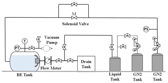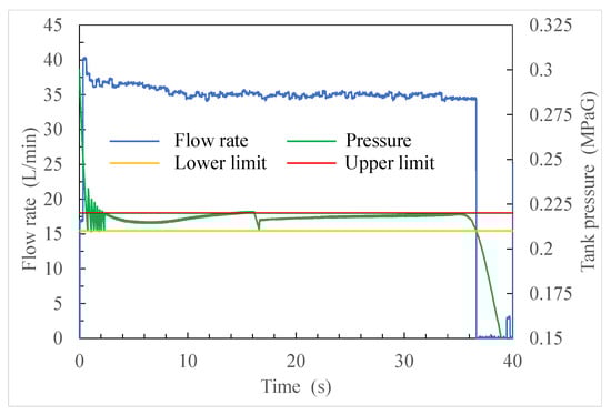 The tank pressure during liquid discharge was set using Bang–Bang control [,]. When the pressure fell below the lower limit pressure, the solenoid valve opened to supply pressurized gas. When the pressure exceeded the upper limit pressure, the solenoid valve shut off to stop the pressurized gas supply. The tank pressure was adjusted between the lower and upper limit pressures.
