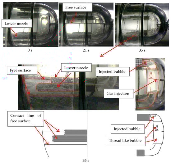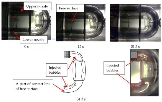 Fluid behavior in the test tank in Test 8. The length of the mesh screen part was 150 mm, the gas supply pressure was 0.65 MPaG, the initial pressure was 0.4 MPaG, the lower limit pressure was 0.31 MPaG, and the upper limit pressure was 0.32 MPaG. The initial liquid level was full. The starting time of liquid discharge was 0 s. At 31.3 s, an injected bubble was seen, and the free surface was located near the bottom of the lower nozzle.