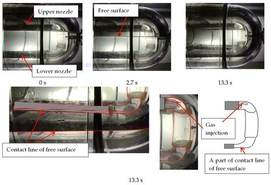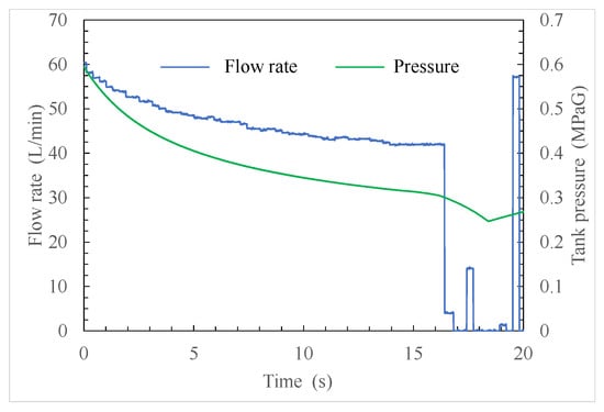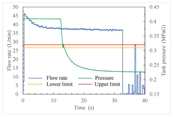 Figure 7 illustrates the liquid behavior in the tank, and Figure 8 denotes the time history of the liquid discharge flow rate and the tank pressure under the conditions of Test 2. The average flow rate was 35.3 L/min, which was close to the design flow rate of 36 L/min. Furthermore, the tank pressure was maintained within the range between the upper and lower limits. As illustrated in the figure, gas entrainment was observed near the liquid outlet 35 s after the liquid was discharged; it can be seen that, at this point, the liquid level had almost reached the center of the lower nozzle.