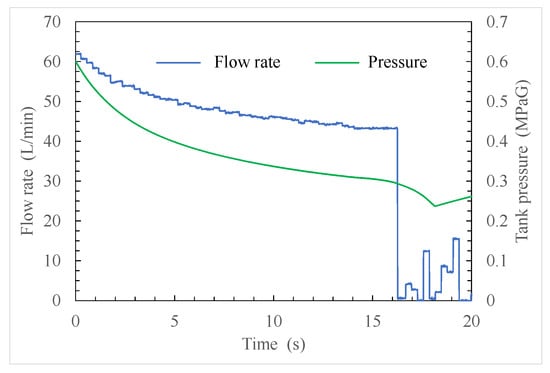 Time history of flow rate and tank pressure in Test 6. The length of the mesh screen part was 110 mm, and the gas supply pressure was 0.65 MPaG. The initial liquid level was half. The starting time of liquid discharge was 0 s.