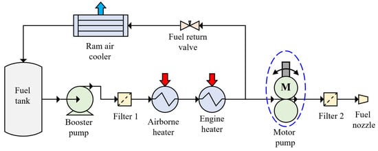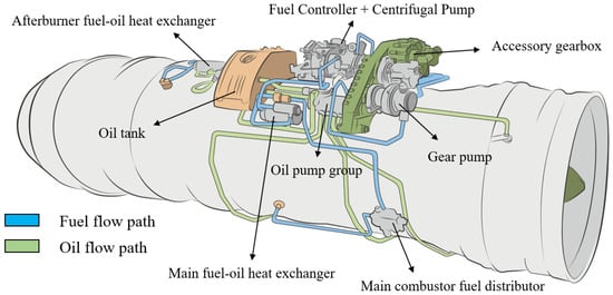 In the assessment of the thermal management characteristics of fuel systems, extensive research has been conducted focusing on variations in fuel temperature. For instance, Yang et al. [] developed a steady-state thermal management simulation program for fuel systems to calculate the distribution of fuel temperature. Kang et al. [] analyzed the fuel temperature rise using Flowmaster software, and found that the fuel flow back to the tank could effectively reduce the fuel temperature. Liu et al. [] constructed a thermal management system model for engines that includes an intermediate circulation using a thermal flow method, optimizing the heat exchange performance between oil and fuel. Moreover, the thermal generation within the fuel system itself has become a significant area of research. Oba and Gonda [] proposed that a variable-speed fuel pump can effectively reduce thermal generation within the system. Oppenheimer et al. [] demonstrated that reducing the capacity of the main pump in a dual-pump system can decrease thermal load on the fuel pump and enhance the system’s thermal resilience. Despite the significant advancements achieved in understanding the thermal management characteristics of fuel systems, current research primarily focuses on the impact of heat load on fuel temperature, lacking a systematic analysis of the heat generation by various components within the fuel system. Furthermore, there exists a strong coupling effect between the fuel system and the engine’s main flow path system. Figure 1 illustrates a schematic of the external piping system of a typical engine with a low bypass ratio. The fuel system precisely supplies fuel to the main flow path system (combustor) through the fuel controller and distributor. Meanwhile, the main flow path system extracts a significant amount of power from the high-pressure shaft, which is transmitted via the accessory gearbox to drive the fuel pump. However, existing research often treats the fuel system as a relatively independent subsystem, failing to adequately consider its coupling effects with the engine’s main flow path system. The lack of integrated models that simultaneously evaluate transient heat transfer in both subsystems represents a critical gap. Therefore, establishing a comprehensive transient temperature evaluation model that takes into account both the fuel system and the main flow path system is crucial for revealing the impact of fuel system operation on the thermal management performance of the engine. This task has emerged as a significant objective in the current research.