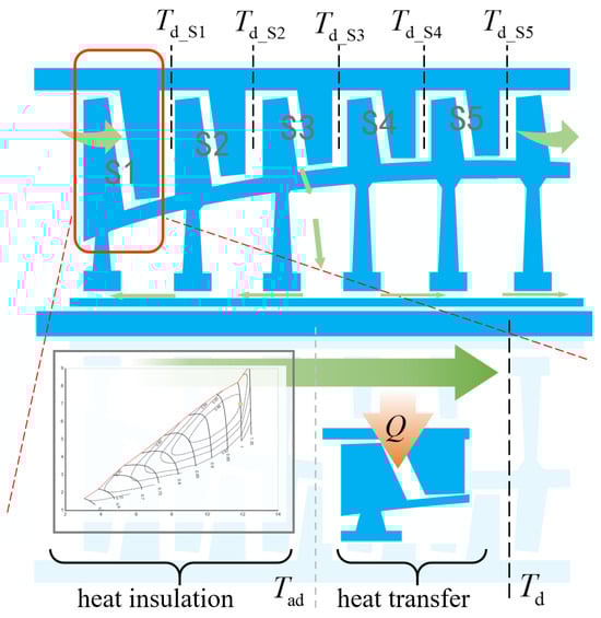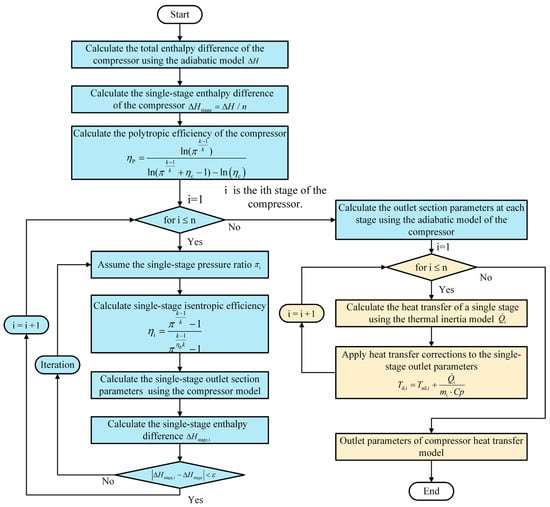 In this paper, the modeling principle of equal polytropic efficiency and equal stage work is used to model the multi-stage components. Figure 3 presents the thermal analysis process for the axial-flow compressor. First, the adiabatic model is used to calculate the outlet parameters at each stage of the compressor. Subsequently, according to the heat transfer modeling method based on the finite volume method described in Section 2.1, the heat transfer of each stage is calculated, and the heat transfer correction is performed on the outlet parameters of each stage. Finally, the compressor outlet correction parameters considering the heat transfer effect are obtained.