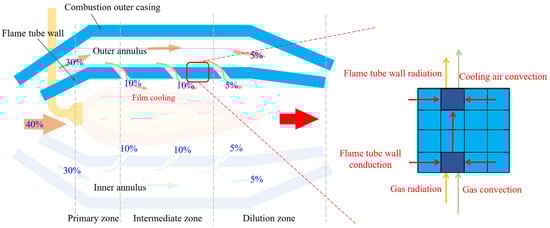 High-temperature components in aero-engines, primarily referring to the combustor and high-pressure turbine, generally operate in a high-temperature gas environment. Effective thermal protection for high-temperature components is crucial to ensure the reliable operation of the engine. The main measures for thermal protection of high-temperature components include the use of cooling air for cooling and the adoption of heat-resistant materials for thermal insulation. Figure 4 illustrates the thermal analysis of the combustor. The flame tube is divided into the primary zone, intermediate zone, and dilution zone along its axial direction []. The air enters through the inlet hole on the flame tube according to the predetermined requirements to ensure that the combustor can achieve efficient and stable combustion under different working conditions. The right side of Figure 4 is the heat transfer diagram of the flame tube wall. The heat transfer mode of the inner wall of the flame tube includes the radiation of high-temperature gas and the convective heat transfer with the cooling air. The outer wall of the flame tube exchanges heat with the cooling air flow through convective heat transfer, and exchanges heat with the casing of the combustor through radiation. When conducting thermal analysis of the combustor, all the heat transfer must be comprehensively considered.
