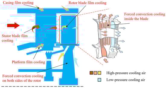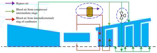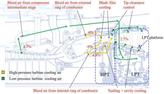 The small-bypass-ratio turbofan engine used in this paper adopts the structure with a one-stage HPT and a two-stage LPT. Figure 7 illustrates the distribution of cooling air for the turbines and the bleed air ratio (the proportion of bleed air to the compressor inlet flow). There are film cooling holes on the surface of the stator and rotor blades of the HPT. The cooling of the stator blades is achieved by utilizing air extracted from both the internal and external rings of the combustor. The cooling of the rotor blades only depends on the air extracted from the internal ring of the combustor. This cooling air enters the rotor blades through a pre-rotation system, which is not only used to cool the rotor blade, but also plays a sealing role. The LPT employs a solid blade design, with air from the intermediate stages of the compressor split into two parts: one portion is used to purge the high- and low-pressure turbine casings to control the tip clearance, while the other portion enters the low-pressure rotating cavity through ventilation holes in the stator blades of the LPT, primarily used for sealing and cooling the rotating cavity.