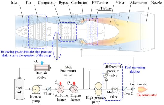 The power that drives the operation of the fuel thermal management system is extracted from the high-pressure shaft of the engine and transmitted to the fuel system after being decelerated by the gearbox. The fuel stored in the fuel tank is first filtered by a coarse filter to remove impurities. After being pressurized by the booster pump, it passes through the airborne heater and the engine heater in turn. The fuel absorbs the thermal load of the aircraft system and the engine lubrication system, respectively. The heated fuel is further pressurized by a gear pump and enters the fuel metering device. In the process of fuel metering, the fuel mass flow into the combustor is accurately controlled by adjusting the aperture of the differential pressure valve. A fuel return valve is employed to regulate the fuel temperature. If there is a risk of fuel overheating, the fuel return valve opens wider to allow more cool fuel from the aircraft to flow into the fuel system, thereby reducing the fuel temperature to an appropriate level. Additionally, during its return to the fuel tank, the fuel is cooled by a ram air cooler.