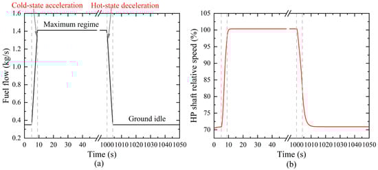 Fuel control schedule during transient process. (a) Variation of fuel mass flow rate (b) Variation of relative speed of HP shaft.