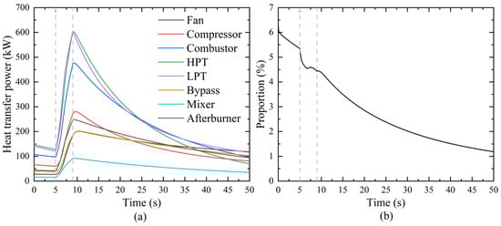Figure 11 illustrates the heat transfer power of various components and the proportion of total heat transfer power relative to the total energy input into the combustion chamber for the aero-engine cold-state acceleration considering the heat transfer effects. Among the components in the mainstream path of the aero-engine, the heat transfer power of the high-temperature components is the highest. Specifically, the maximum heat transfer power of the high-pressure and low-pressure turbines during the cold-state acceleration process reaches 600 kW, while the heat transfer power of the combustion chamber is 480 kW. This indicates that these components play a dominant role in the absorption and transfer of heat during the cold-state acceleration process. The total heat transfer power achieves its maximum value at the end of the acceleration process, exceeding 2600 kW, highlighting the significant impact of heat transfer effects on the transient performance of the engine.