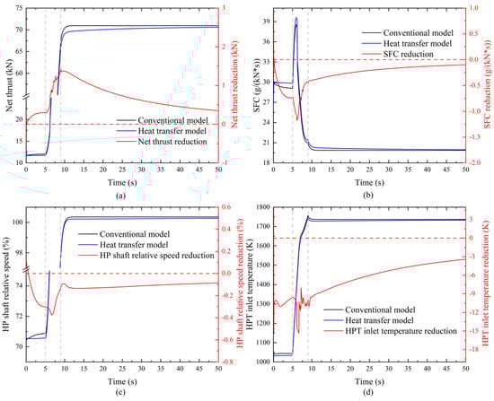 The impact of heat transfer on engine performance during cold-state acceleration. (a) Variation of net thrust (b) Variation of specific fuel consumption (c) Variation of HP shaft relative speed (d) Variation of HP turbine inlet temperature.