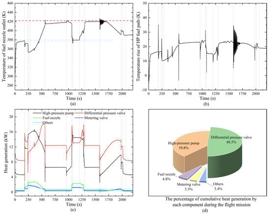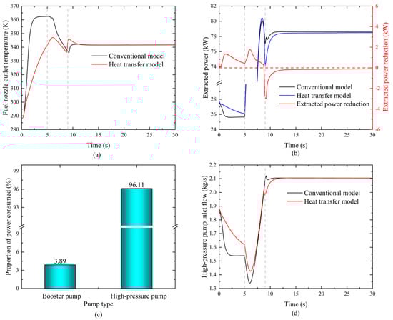 The impact of heat transfer on the fuel system during cold-state acceleration. (a) Variation of fuel nozzle outlet temperature (b) Variation of the extracted power of the fuel system (c) Percentage of pump power consumption (d) Variation of inlet flow rate of high-pressure pump.