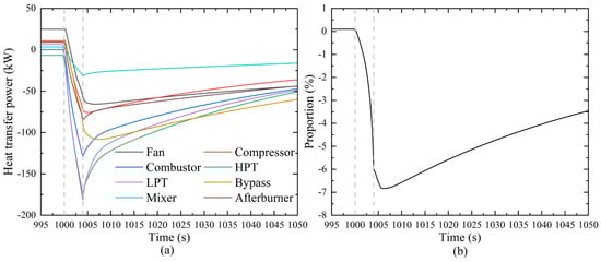 Figure 14b shows the proportion of total heat transfer power relative to the total fuel energy input to the combustor. During the thermal deceleration process, the heat released by the metal components to the mainstream working fluid reaches a maximum proportion of 6.83%. The influence of this heat transfer effect on engine performance and energy distribution remains significant during the hot-state deceleration phase. This result further underscores the importance of considering heat transfer effects for accurate engine performance prediction and optimization of energy management, particularly in transient response processes under different operating conditions.