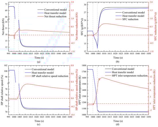 The impact of heat transfer on engine performance during hot-state deceleration. (a) Variation of net thrust (b) Variation of specific fuel consumption (c) Variation of HP shaft relative speed (d) Variation of HP turbine inlet temperature.