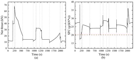 Figure 12 compares the changes of net thrust, specific fuel consumption (SFC), relative speed of the high-pressure shaft and turbine inlet temperature between the model considering heat transfer effect and the conventional adiabatic model during cold-state acceleration. As shown in Figure 12a, during the cold-state acceleration, the engine considering heat transfer effects exhibits a significant reduction in work capacity compared to the conventional adiabatic model. The net thrust of the heat transfer model is consistently lower than that of the conventional model, with the maximum decrease in net thrust occurring at the end of the acceleration process, reaching a reduction of 1.42 kN. The specific fuel consumption (SFC) of the heat transfer model is higher than the conventional model, indicating that the engine exhibits higher fuel consumption, with a maximum increase of 1.18 g/(kN·s), as shown in Figure 12b. Furthermore, the change in work capacity caused by the heat transfer effects also impacts the high-pressure shaft, with the relative speed under the heat transfer model lower than that of the conventional model throughout the cold-state acceleration process. Figure 12d presents the variation in turbine inlet temperature. After considering the heat transfer, the engine absorbs a significant amount of heat, leading to a noticeable decrease in turbine inlet temperature under the same fuel supply rate, with a maximum reduction of 15.4 K. These results demonstrate that the heat transfer effects significantly influence engine performance during the cold-state acceleration, particularly in terms of the loss of engine work capacity and the reduction in fuel economy.