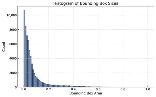 The SPARK-2022 dataset [,], developed by the University of Luxembourg for the Spark Challenge 2022, is specifically designed for space object detection. It consists of 88,000 RGB images with a resolution of 1024 × 1024, representing 10 classes of spacecraft and 1 class of space debris. The dataset is split into a training set of 66,000 images—a validation set of 11,000 images, and a test set of 11,000 images—with an equal distribution of each class across all subsets. The 10 spacecraft classes include smart_1, cheops, lisa_pathfinder, proba_3_ocs, proba_3_csc, soho, earth_observation_sat_1, proba_2, xmm_newton, and double_star, and the space debris includes components from the Space Shuttle’s external fuel tank, orbital docking systems, damaged communication dishes, thermal protection tiles, and connectors. The histograms of bounding box sizes in the training set of the dataset are presented in Figure 1. The horizontal axis represents the proportion of the bounding box area relative to the entire image, while the vertical axis indicates the corresponding frequency. It can be observed that small objects are widely present in the dataset.