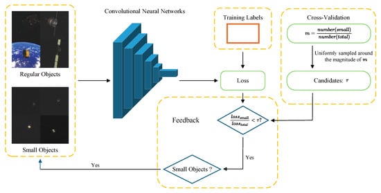 Inspired by this idea, we propose a loss-guided online data augmentation strategy to address the imbalance in optimization, to improve the detection performance of small objects. The essence of the strategy is to use the loss proportion as feedback to guide the optimization of small objects. When the loss contribution from small objects falls below a certain threshold , the number of small object samples in the training set is increased to ensure more thorough optimization. The algorithmic procedure and its corresponding schematic illustration are presented in Algorithm 1 and Figure 3, respectively, where is a hyperparameter representing the desired ratio between the small object loss and the total loss. The selection of the ratio is based on the distribution of small objects in the dataset. Specifically, the proportion m of small objects relative to the total number of objects is first computed. Ten candidate values are then selected around the order of magnitude of m, and a 10-fold cross-validation is conducted to determine the optimal value of . This procedure ensures that the parameter selection is both data-driven and empirically supported. In this study, the chosen value of is 0.4 based on experimental results.