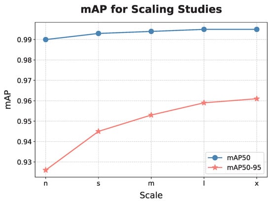 In this experiment, the effectiveness of the proposed method across models of varying sizes is examined. Specifically, models of different sizes, including YOLO11n, YOLO11s, YOLO11m, YOLO11l, and YOLO11x, are compared to assess the impact of model complexity on detection accuracy. Here, the letters n, s, m, l, and x stand for nano, small, medium, large, and extra-large, respectively, indicating progressively larger models with increasing numbers of parameters. The corresponding parameter counts and Floating Point Operations (FLOPs) for each model are presented in Table 5, and the mAP achieved by each model is illustrated in Figure 9. The mAP exhibits a positive correlation with model size, validating the generalizability of the proposed method across architectures of varying scales.