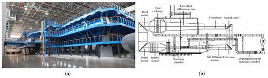 The structural configuration and a full-view photograph of a 2.4 m continuous transonic wind tunnel are presented in Figure 1. This wind tunnel is a major large-scale facility in China, designed for aerodynamic testing and validation of aircraft configurations. Key specifications include a 2.4 m × 2.4 m test section, a Mach number range of 0.3–1.6, a total pressure range of 0.03–0.4 MPa, a total temperature range of 293–333 K, and a maximum Reynolds number of 1.3 × 107.